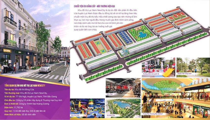 Khu đô thị Lục Nam New City tọa lạc tại trung tâm thị trấn Đồi Ngô, huyện Lục Nam, tỉnh Bắc Giang, với diện tích lên đến 11,792 ha. Dự án do Công ty Cổ phần Xây dựng & Thương mại Duy Anh làm chủ đầu tư, được thiết kế bởi Công ty TNHH Đại Hoàng Dương. Với quy mô 14 lô đất biệt thự và 545 lô đất liền kề, Lục Nam New City mang đến không gian sống hiện đại và cơ hội đầu tư sinh lợi lâu dài.